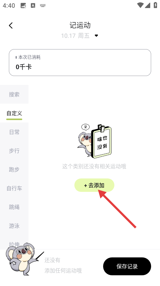 3、在记运动页面,点击【+去添加】按钮,弹出自定义运动弹窗。