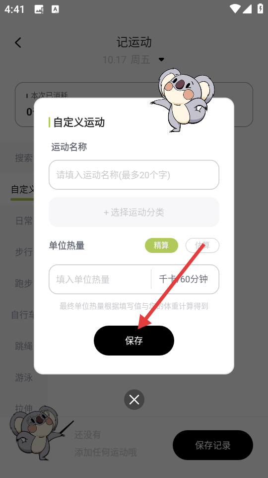 4、在自定义运动弹窗中,填写运动名称、选择运动分类、填入单位热量后,点击【保存】按钮,完成运动的添加。