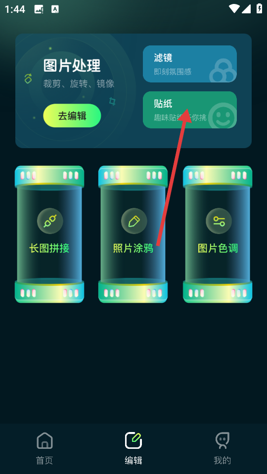 2、在编辑功能页面,点击【贴纸】选项,进入贴纸功能界面。