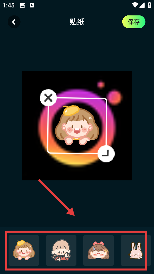 4、在贴纸编辑页面,选择喜欢的贴纸样式,编辑完成后点击【保存】按钮,完成贴纸添加操作。