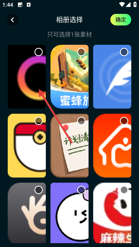 3、在贴纸功能界面,进入相册选择页面,选择一张素材图片。