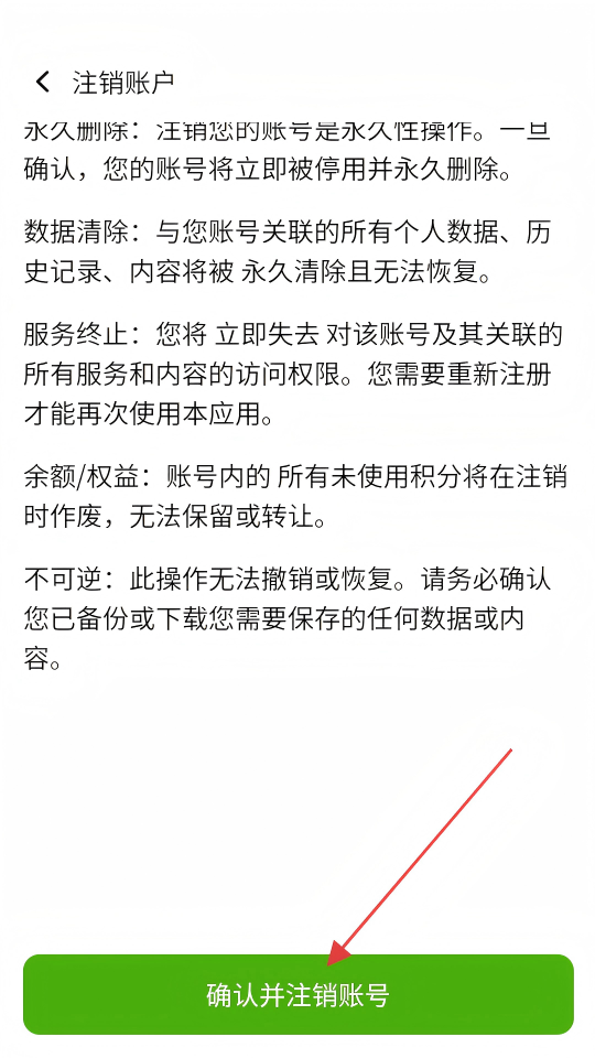4、在注销账户说明页面,点击【确认并注销账号】,完成账号注销。