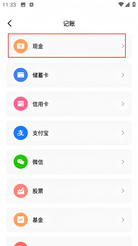 3、在记账类别选择页面,选择【现金】,进入添加现金页面。