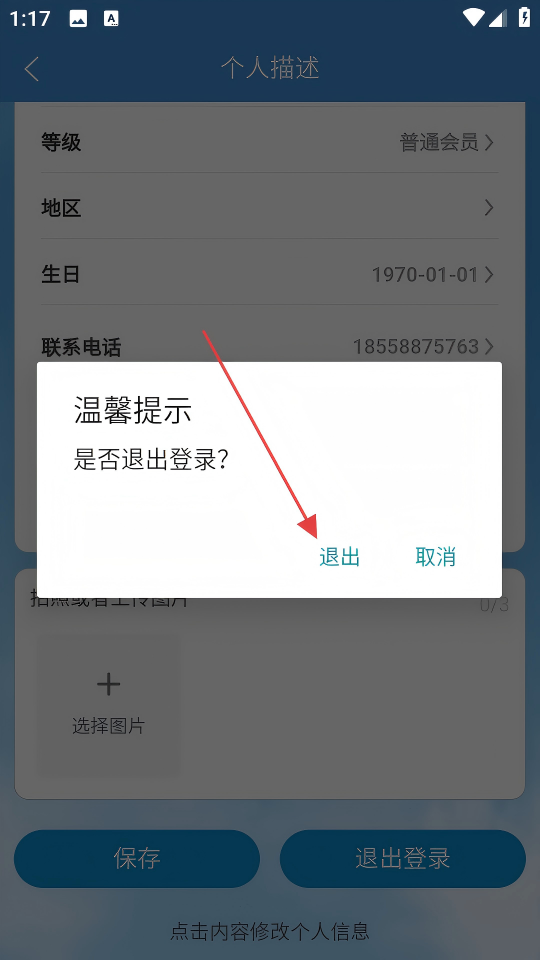 4、在温馨提示弹窗中,点击【退出】,完成退出登录操作。