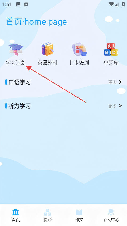 1、在首页点击【学习计划】,进入“学习计划”页面。