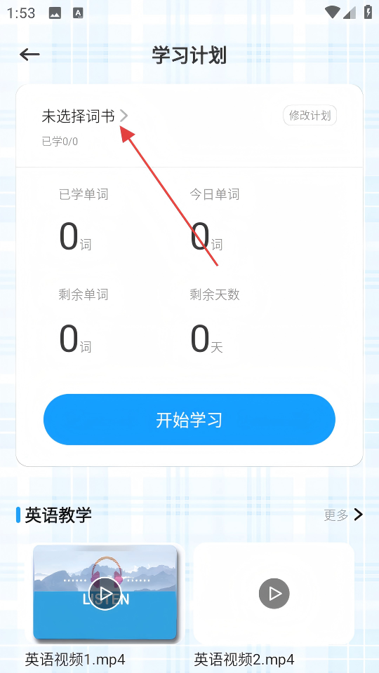 2、在“学习计划”页面,点击【未选择词书】,进入“书库”页面。