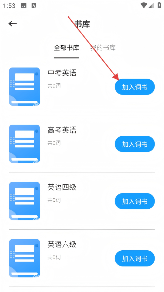 3、在“书库”页面,点击“中考英语”对应的【加入词书】,完成词书添加操作。