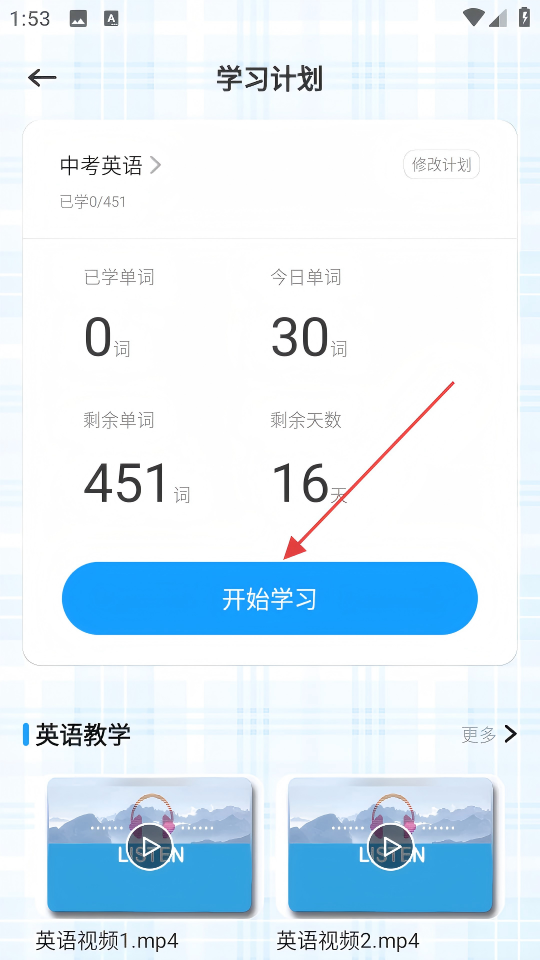 4、回到“学习计划”页面,点击【开始学习】,即可开始“中考英语”词书的学习。