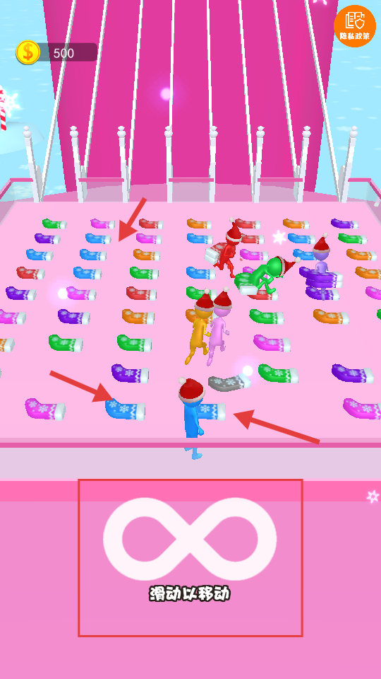2、通过滑动屏幕移动角色,收集地面上的袜子,界面顶部显示【500】金币。