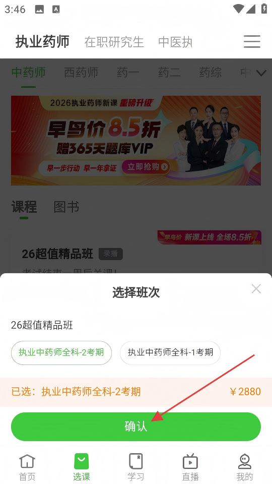 3、在选择班次弹窗中,选好班次后点击【确认】按钮,进入购物车页面。