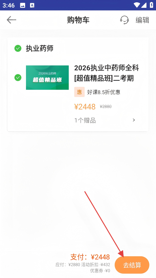 4、在购物车页面,点击【去结算】按钮,完成课程费用支付流程。