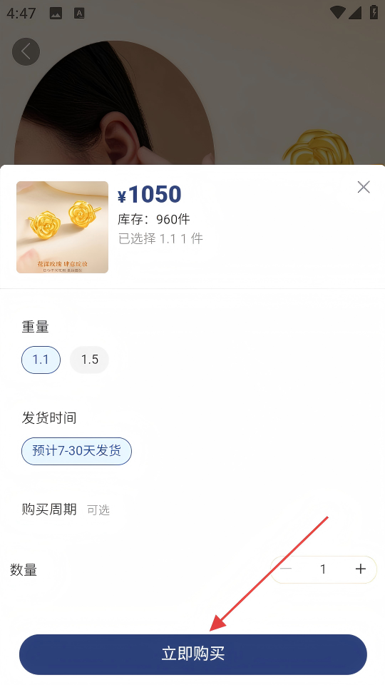 3、在商品详情页面,点击【立即购买】按钮,进入规格选择页面。