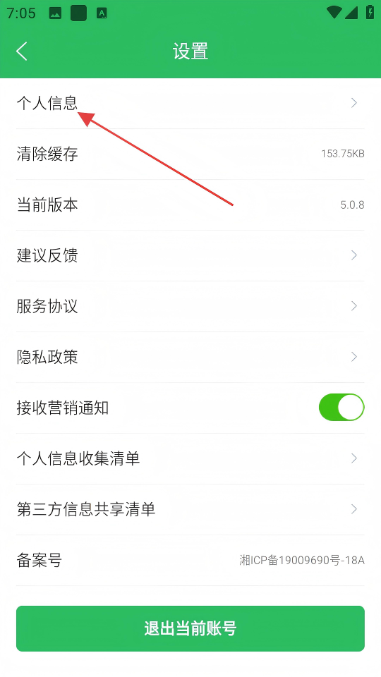 3、在设置页面,点击【个人信息】选项,进入账号信息页面。