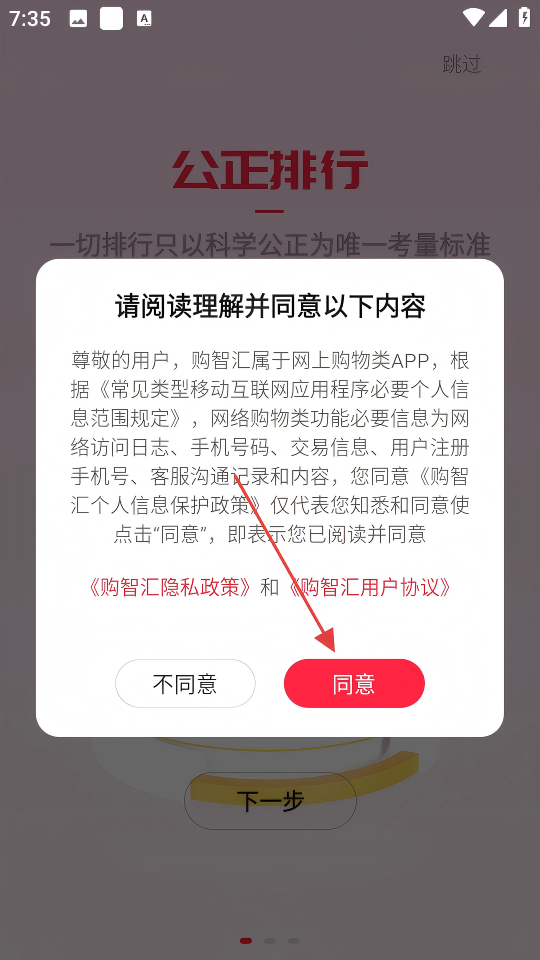 1、在弹窗中点击【同意】按钮,进入APP首页。