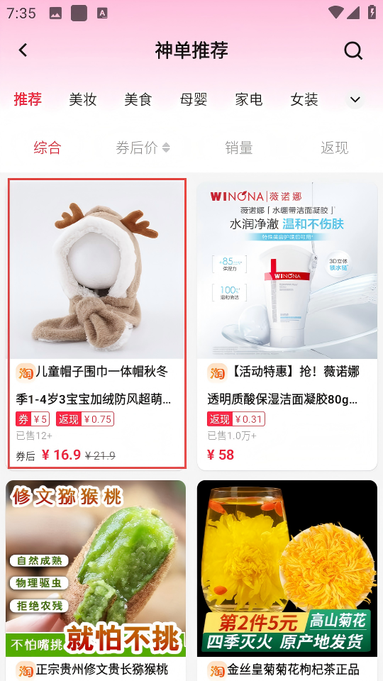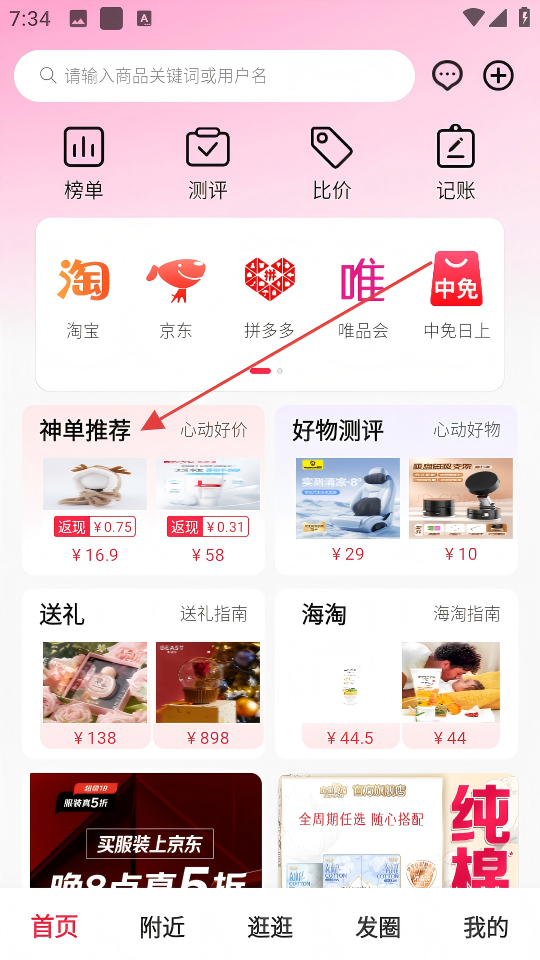 2、在首页,点击【神单推荐】板块,进入神单推荐页面。