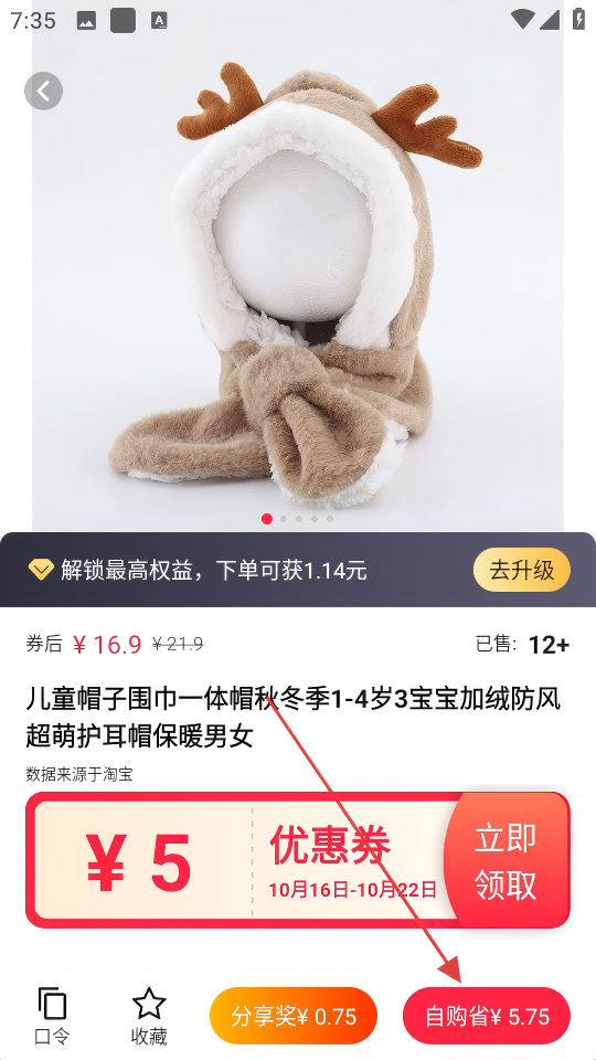 4、在商品详情页面,点击【自购省¥5.75】按钮,进入购买流程完成商品购买。