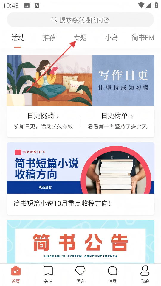 1、在应用首页,点击【专题】选项,进入专题页面。