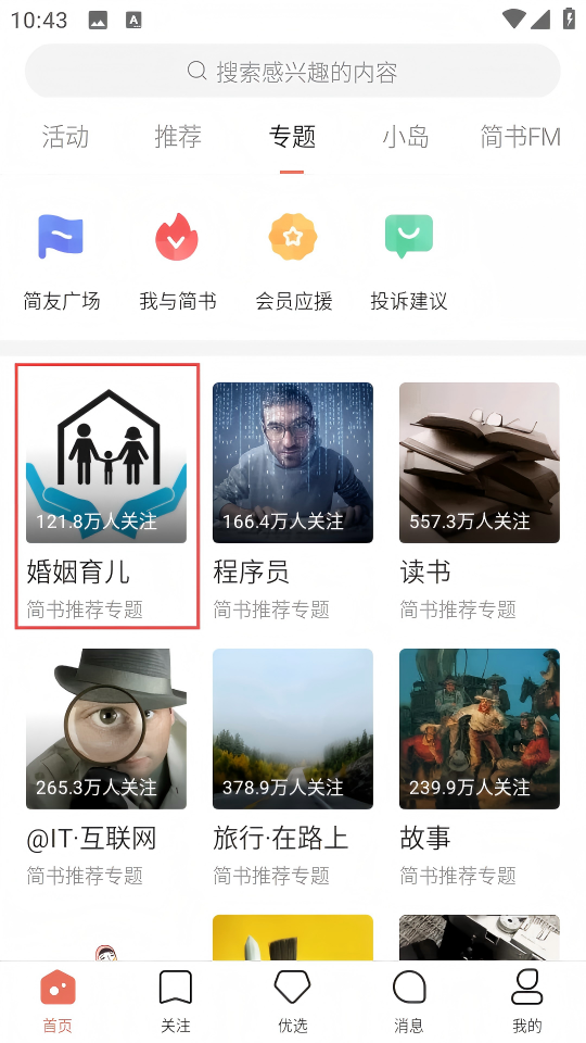 2、在专题页面,点击【婚姻育儿】专题,进入该专题详情页面。