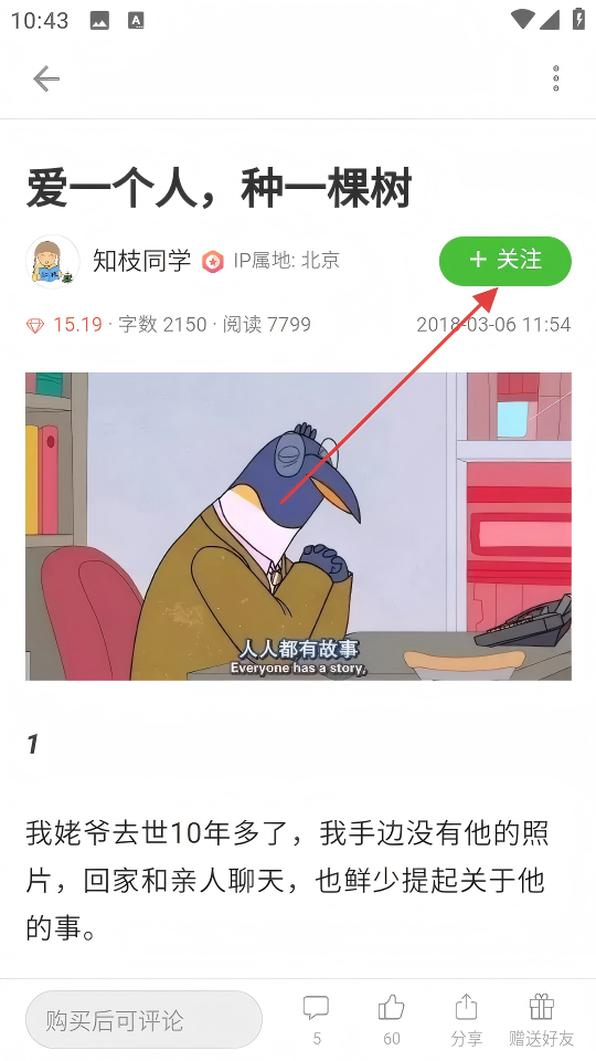 4、在文章详情页面,点击【+关注】按钮,即可关注该文章作者。