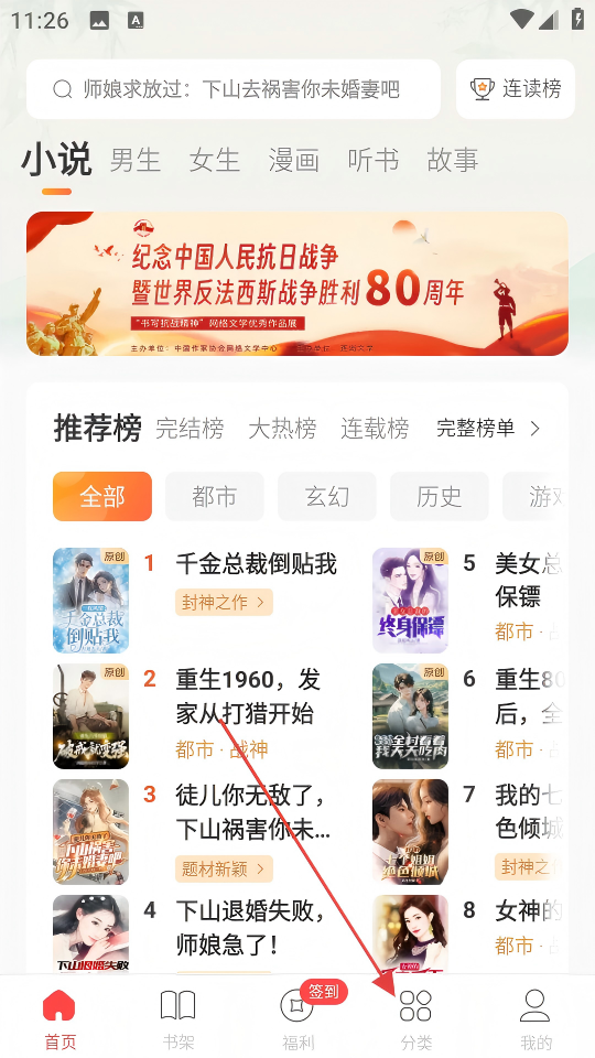 1、在应用首页,点击底部【分类】选项,进入分类页面。