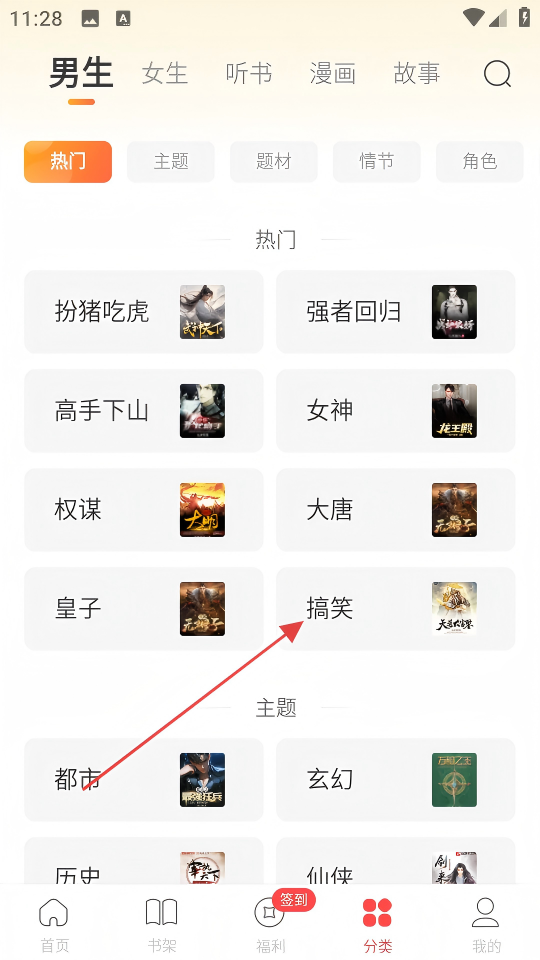 2、在分类页面的男生分类下,点击【搞笑】标签,进入搞笑小说分类页面。