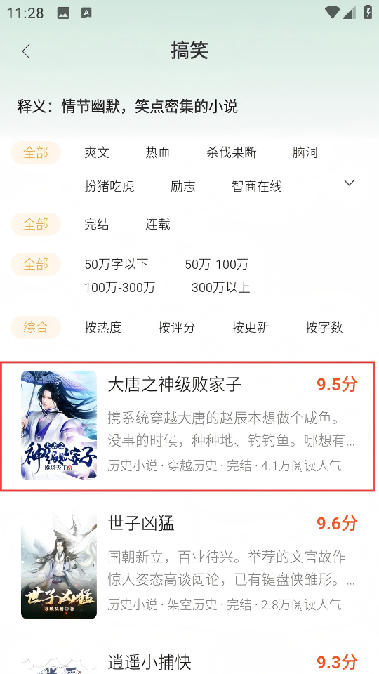 3、在搞笑小说分类页面,选择《大唐之神级败家子》小说,进入其详情页面。