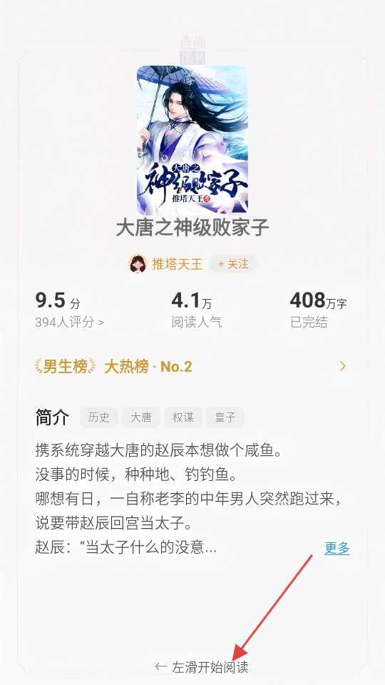 4、在小说详情页面,左滑开始阅读,即可开始阅读该小说。