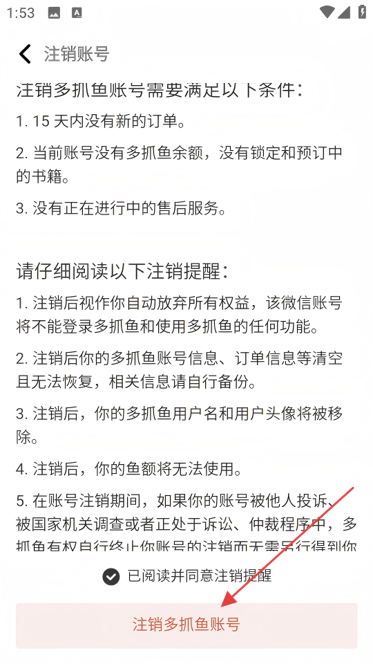 4、在注销账号页面,点击【注销多抓鱼账号】按钮,完成账号注销操作。