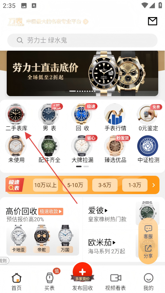 1、在应用首页,点击【二手表库】选项,进入二手表库页面。