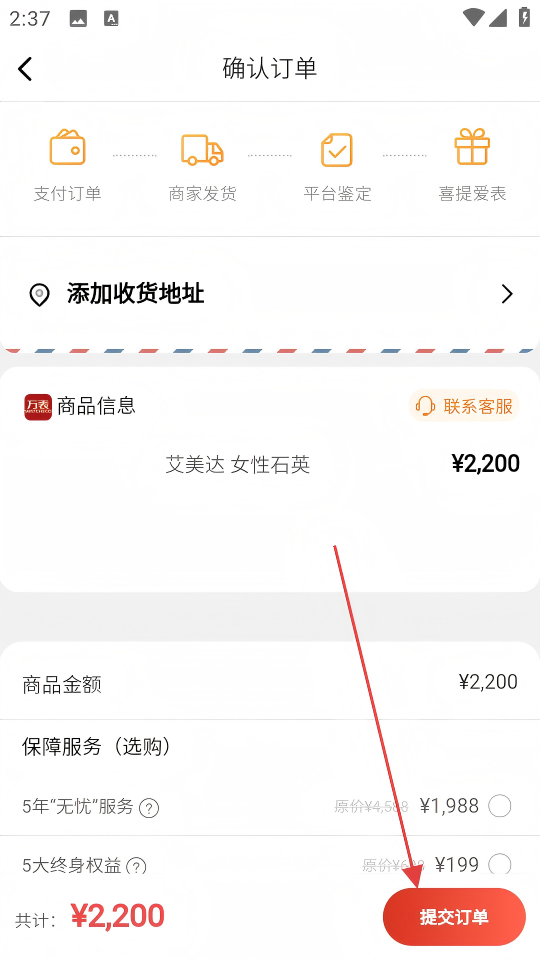 4、在确认订单页面,添加收货地址后,点击【提交订单】按钮,完成手表购买操作。