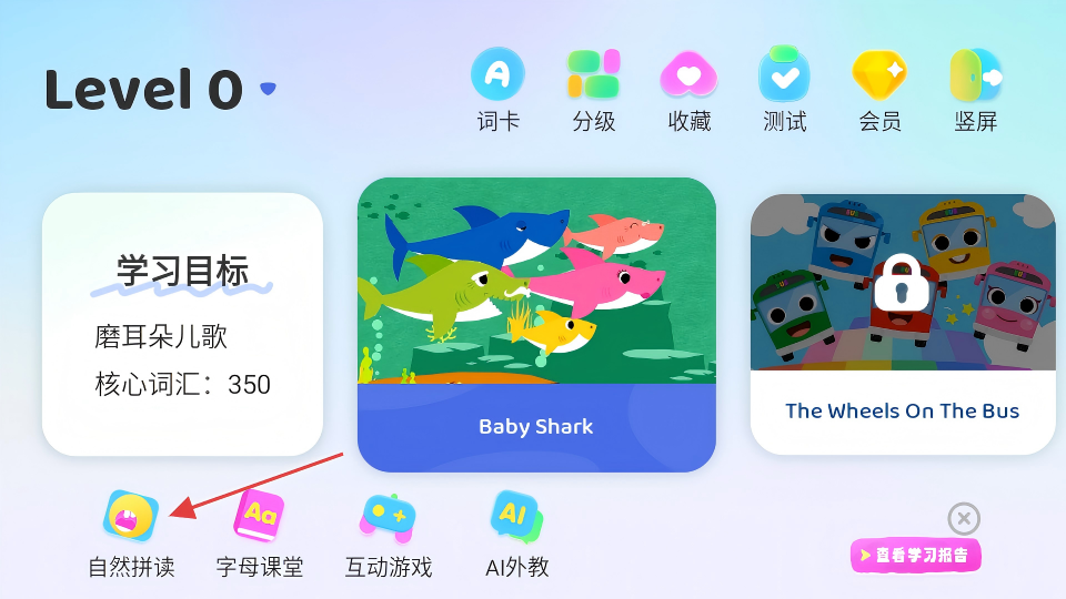 1、在Level-0界面,点击【自然拼读】选项,进入趣学自然拼读页面。