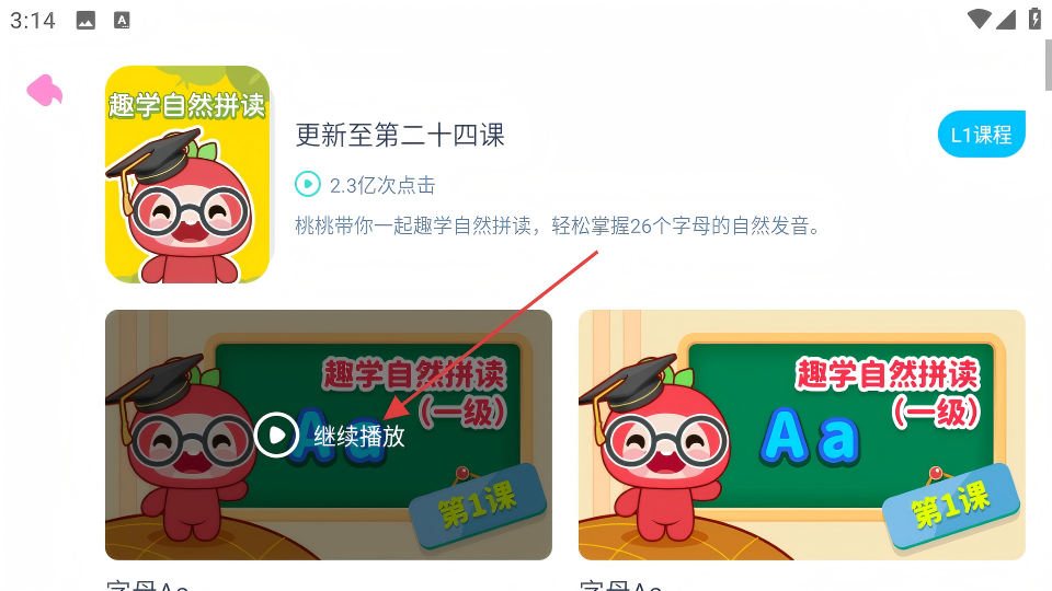 2、在趣学自然拼读页面,点击“继续播放”区域,进入学习模块选择页面。