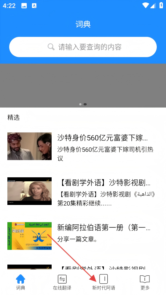1、在词典应用页面,点击底部【新时代阿语】选项,进入新时代阿语学习页面。