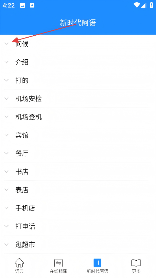 2、在新时代阿语学习页面,点击【问候】分类前的展开箭头,展开问候类阿语内容。