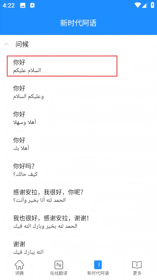 3、在展开的问候类阿语内容中,点击“你好”对应的阿拉伯语表达,进入其详情页面。