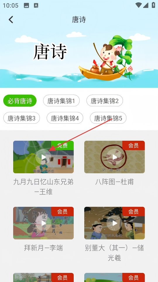 3、在唐诗学习页面,点击免费的【九月九日忆山东兄弟—王维】视频,进入视频播放页面。