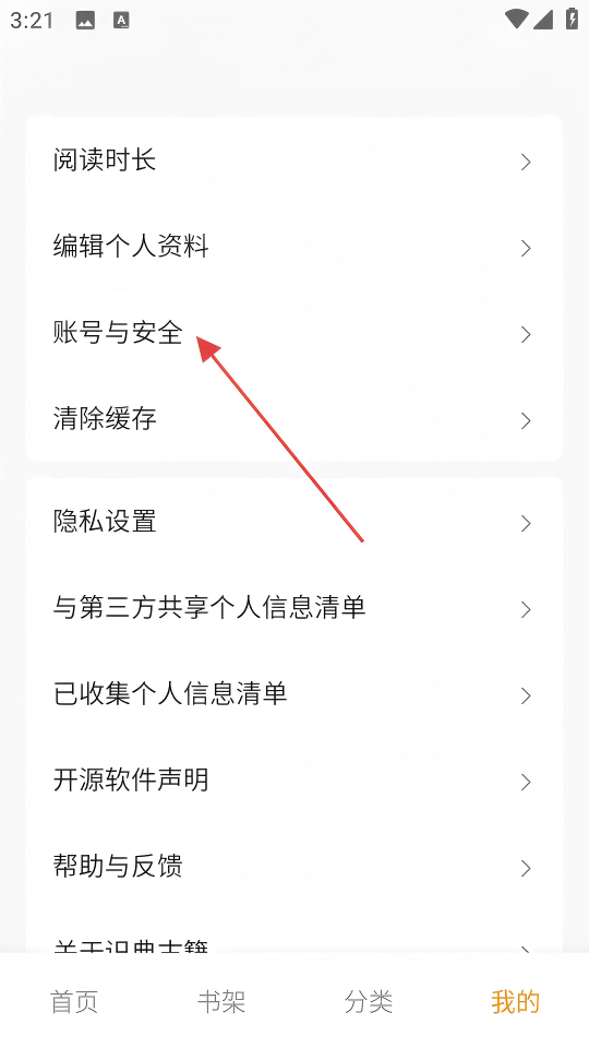 1、在“我的”页面,点击【账号与安全】选项,进入账号与安全页面。