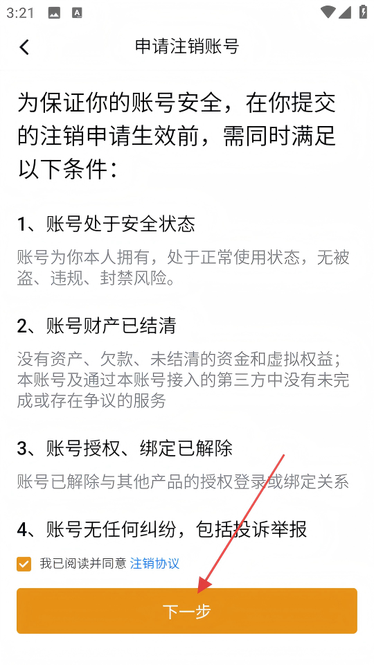 3、在申请注销账号页面,确认满足注销条件后,点击【下一步】。