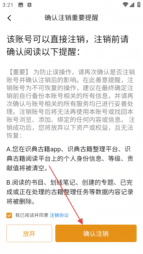 4、在确认注销重要提醒页面,点击【确认注销】按钮,完成账号注销操作。