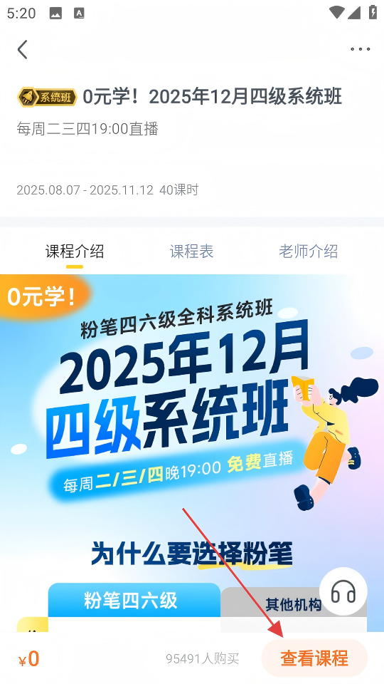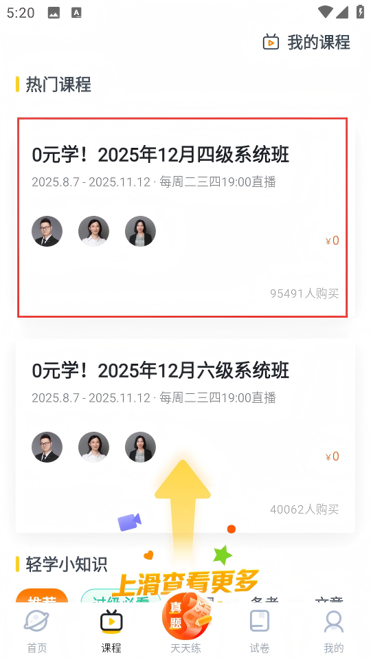 2、在课程页面的热门课程中,点击【0元学!2025年12月四级系统班】,进入课程详情页面。
