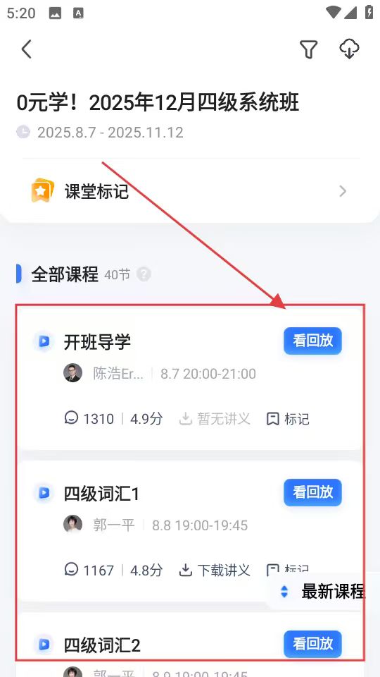 4、在课程列表页面,选择具体课程,点击【看回放】即可观看课程回放。