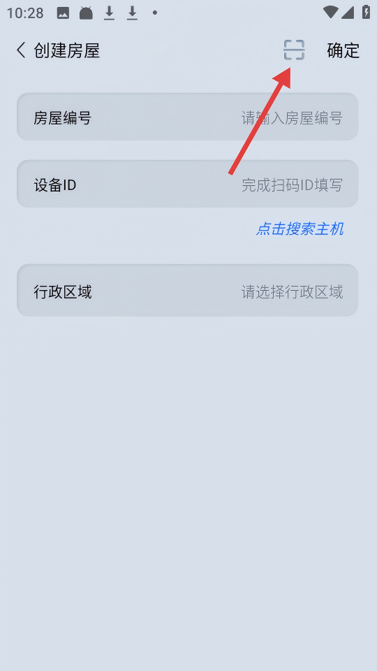 3、在【创建房屋】页面,点击上方的扫码图标,进入扫描二维码页面。