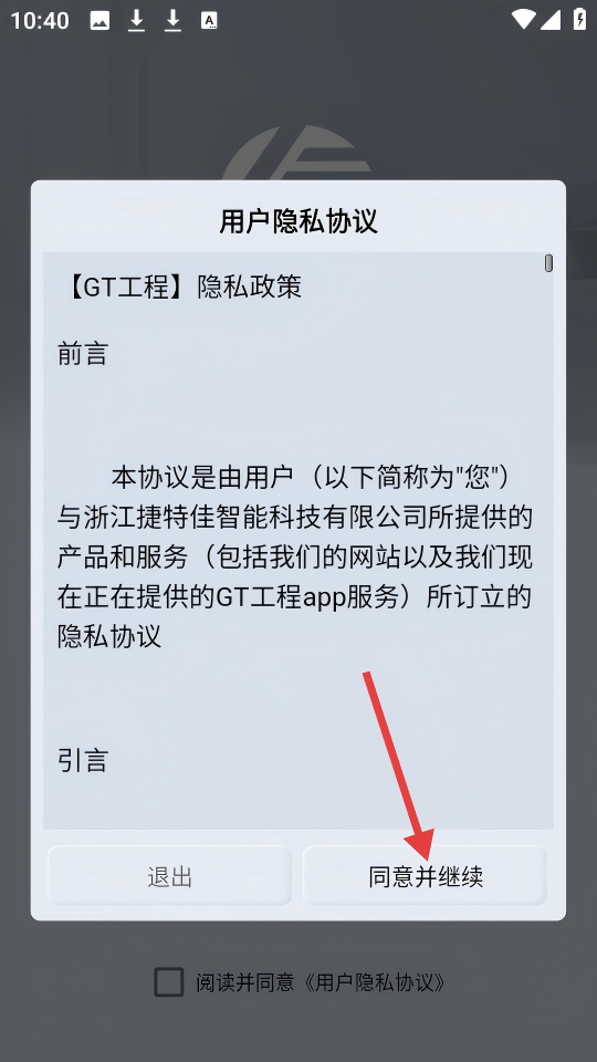 1、在【用户隐私协议】弹窗中,点击【同意并继续】按钮,即可继续使用应用。