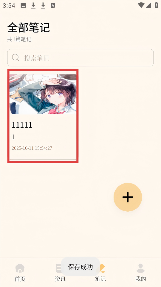 4、在【笔记】页面可查看已保存的笔记,显示笔记内容及保存时间。