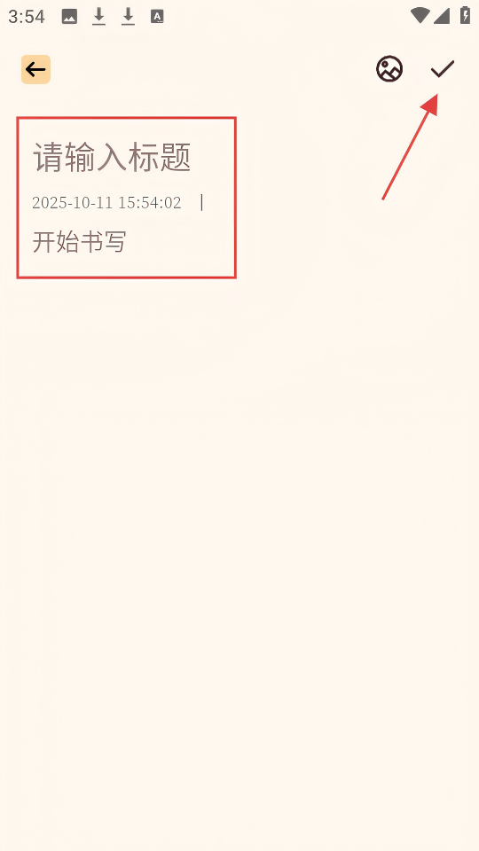 3、在笔记编辑页面,输入【请输入标题】和内容后,点击右上角的对勾按钮,可保存笔记。