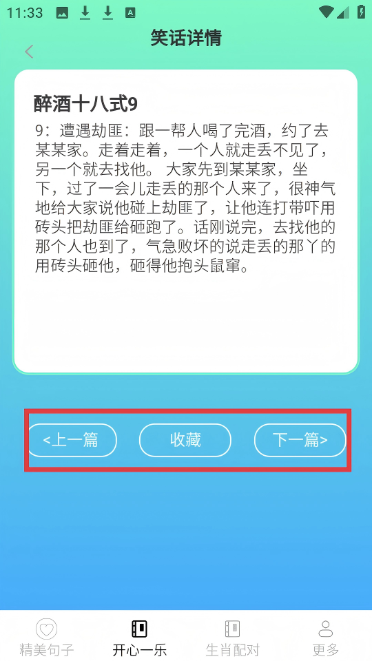 4、在笑话详情页,可点击【上一篇】查看上一则笑话,点击【收藏】收藏当前笑话,点击【下一篇】查看下一则笑话。