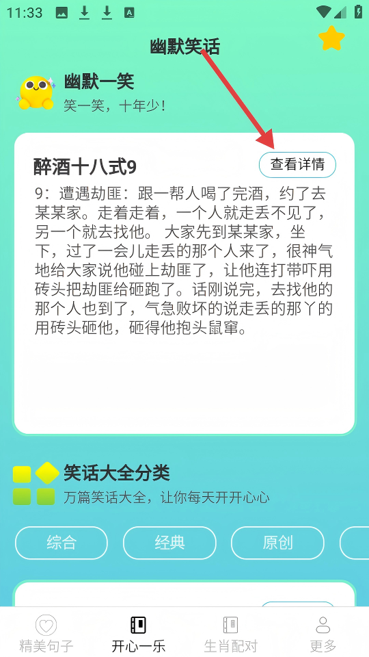 3、在幽默笑话板块,看到感兴趣的笑话,点击【查看详情】按钮,可查看该笑话的详细内容。