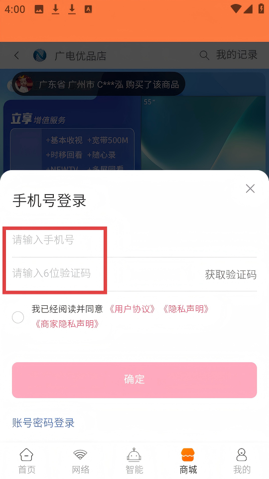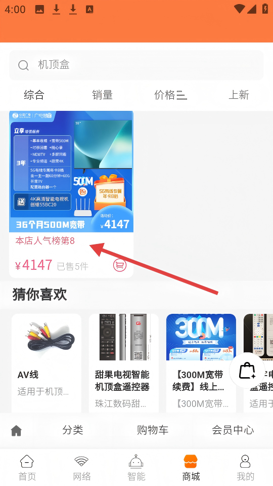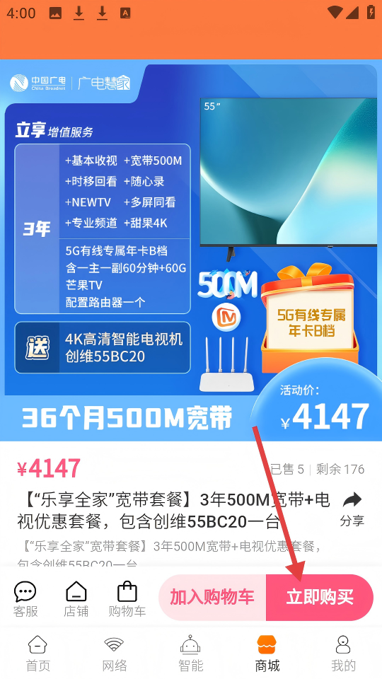2、在商城页面,点击【36个月500M宽带】商品,进入商品详情页。