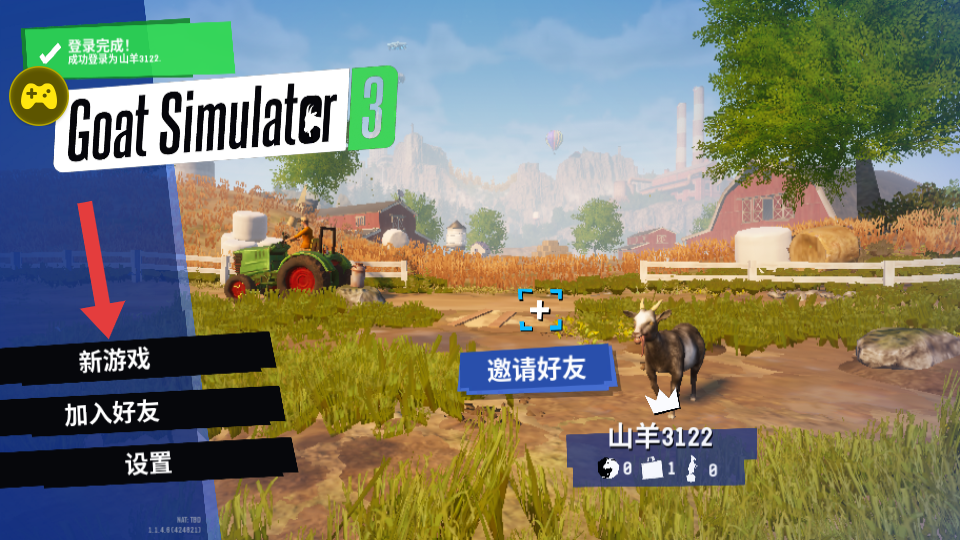 1、点击【新游戏】开始游戏,利用辅助菜单可快速解锁各类功能,开启山羊冒险。