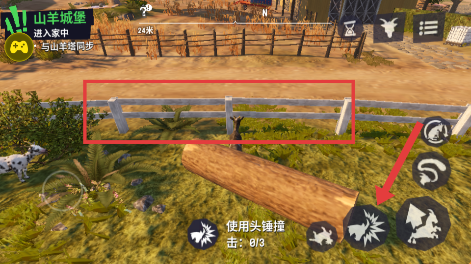4、点击头锤撞击键,破坏围栏等障碍物,辅助菜单让破坏操作更便捷,完成【山羊城堡-进入家中】任务。